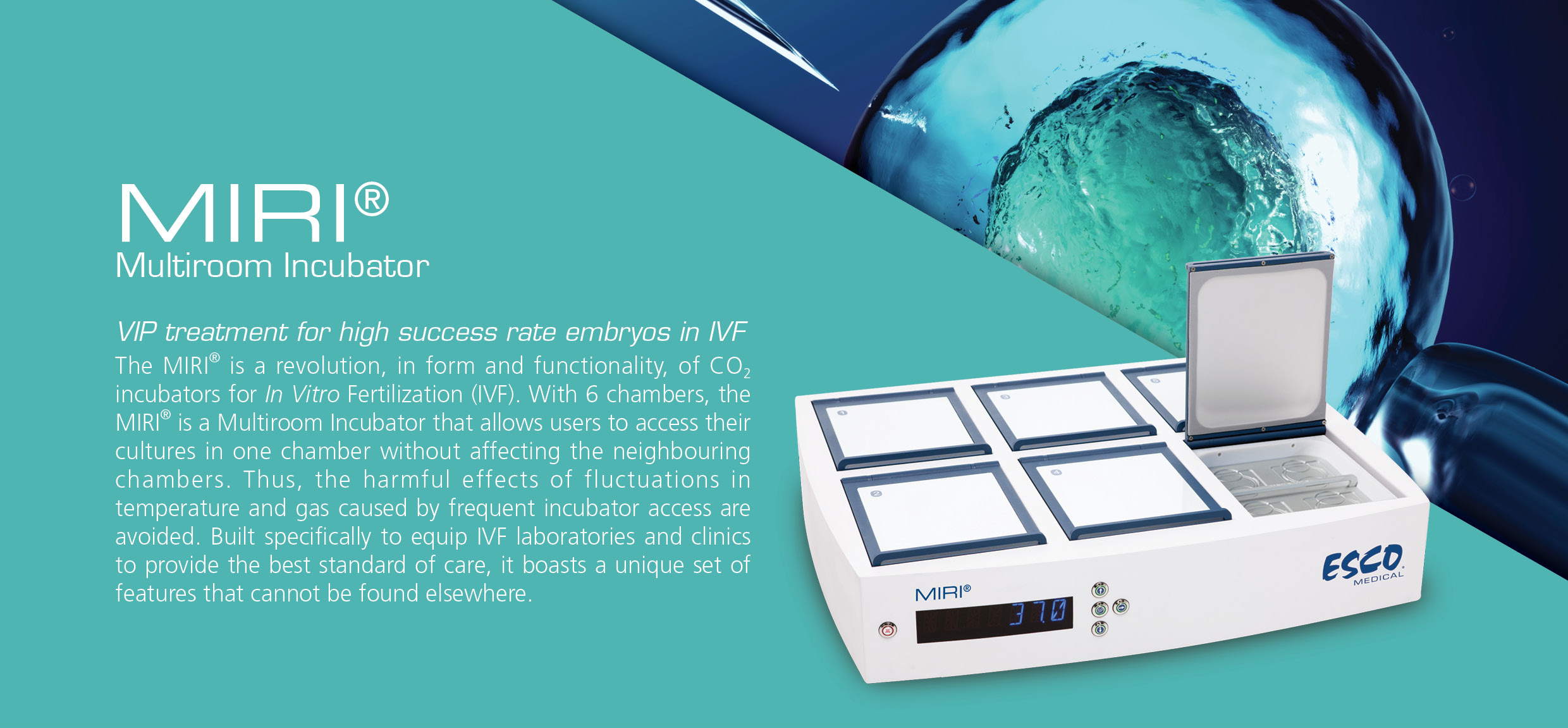 体外受精实验室使用培养箱提供稳定的环境条件,优化胚胎在体外的生长发育。为了做到这一点,培养箱必须能够调节上述参数。随着技术的突破,Esco Medical发明了一种为胚胎提供有利条件的培养箱。Esco的MIRI多腔室培养箱是一个桌面培养箱,有6个独立的腔室,彼此完全独立。多腔室培养箱的主要优点是允许用户在不影响其他腔室的情况下观察培养物。该设备的其他会提高胚胎培养的质量影响如下。